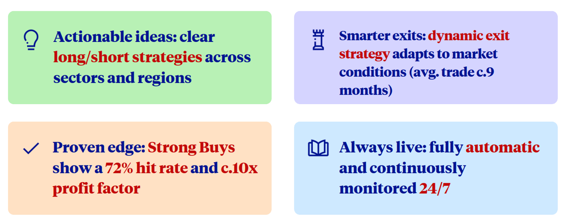 Trade ideas follow a dynamic exit rule, closing either when valuations revert or after a 12–24 month holding cap. With an average duration of c.9 months, the model balances alpha generation with effective risk control. Since 2015, Quantitative Edge has produced over 400 confirmed trade signals with: